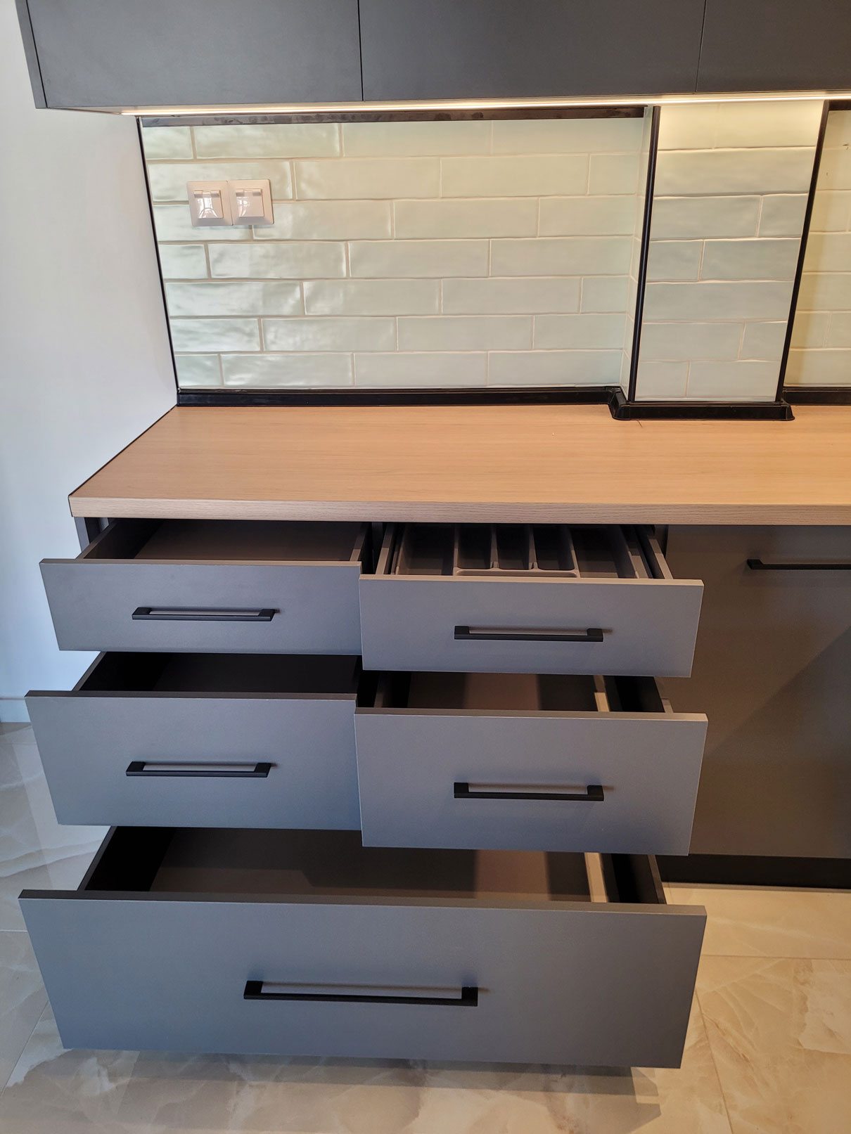 Ενσωματώθηκαν λύσεις αποθήκευσης υψηλής λειτουργικότητας, όπως ντουλάπι νεκρής γωνίας, τροφoθήκη και μπαχαροθήκη, ενώ προστέθηκαν τέσσερα μικρά συρτάρια για τις καθημερινές ανάγκες του νοικοκυριού και ένα βαθύ συρτάρι 90cm για μεγαλύτερα σκεύη.