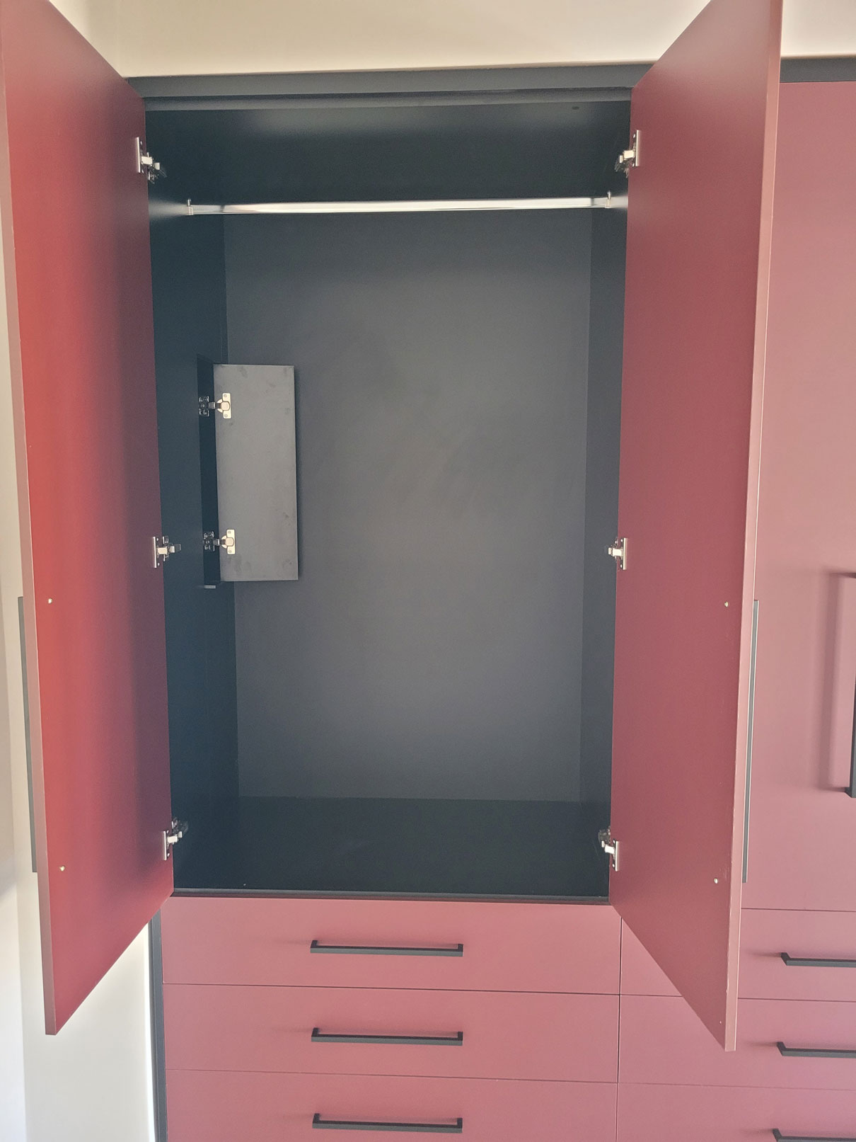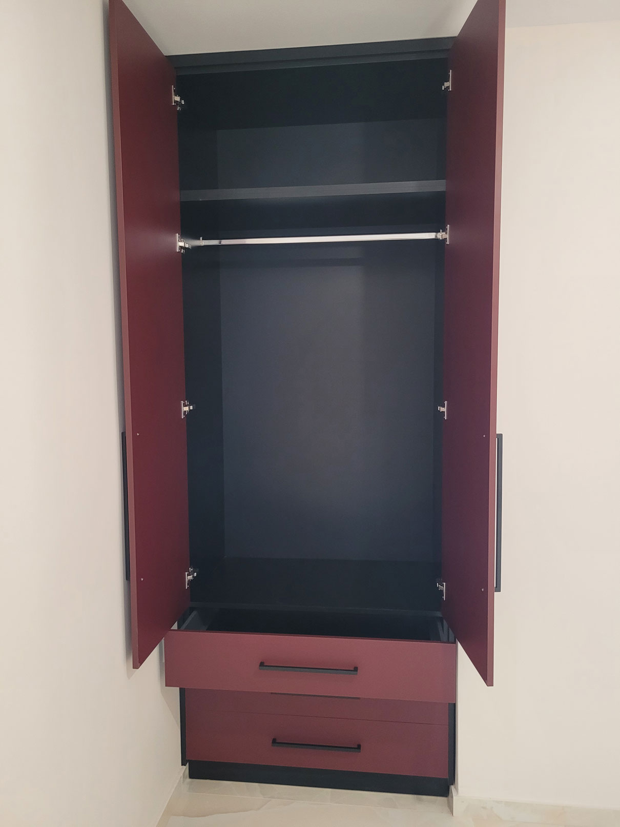 Η δίφυλλη ντουλάπα κατασκευάστηκε με πόρτες από MDF σε μπορντό απόχρωση και κουτιά από μαύρη μελαμίνη, δημιουργώντας έντονη αλλά ισορροπημένη αντίθεση.