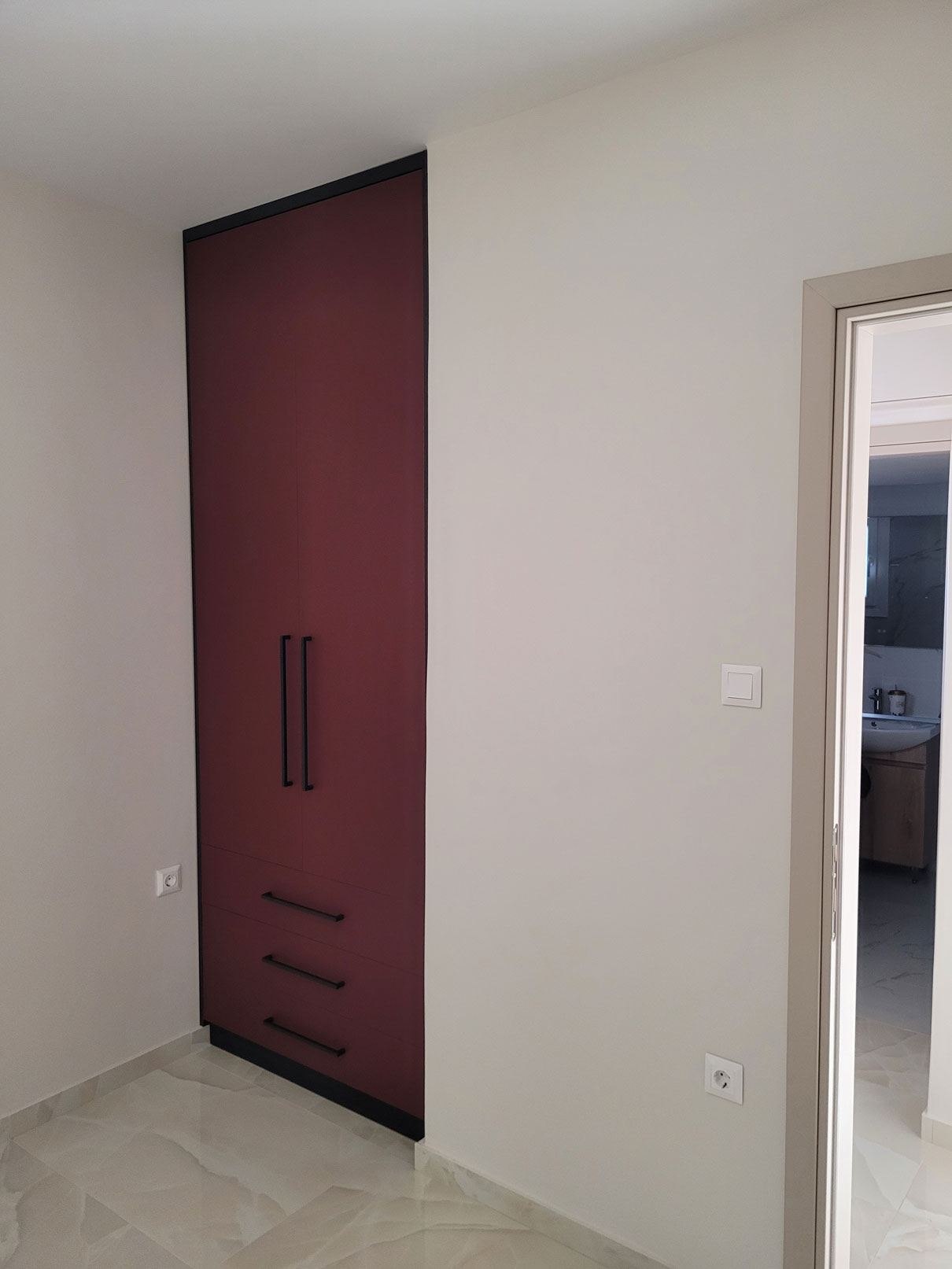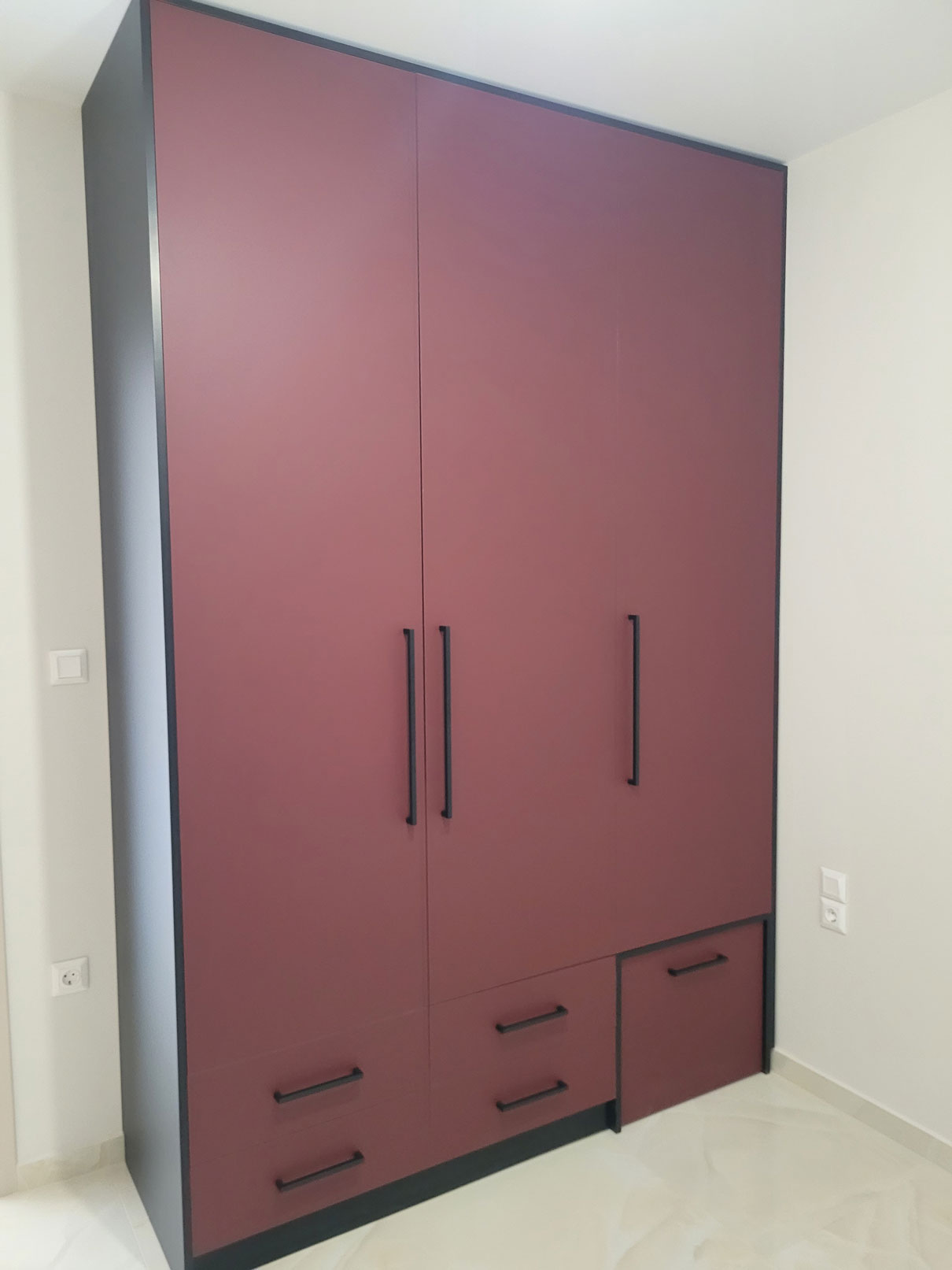 Η τρίφυλλη ντουλάπα ακολουθεί τον ίδιο συνδυασμό υλικών, με μπορντό MDF πόρτες και μαύρη μελαμίνη στο εσωτερικό, δίνοντας χαρακτήρα και βάθος στον χώρο.