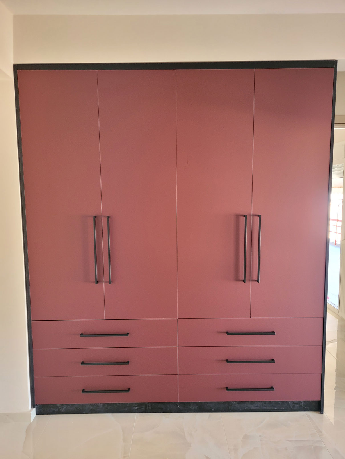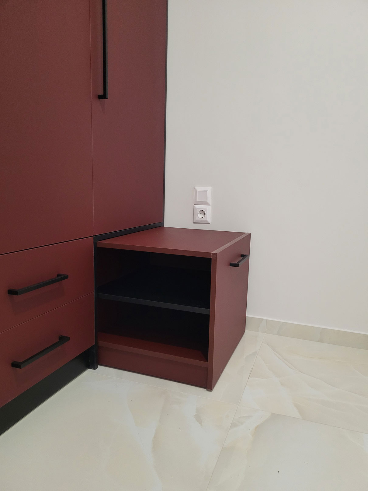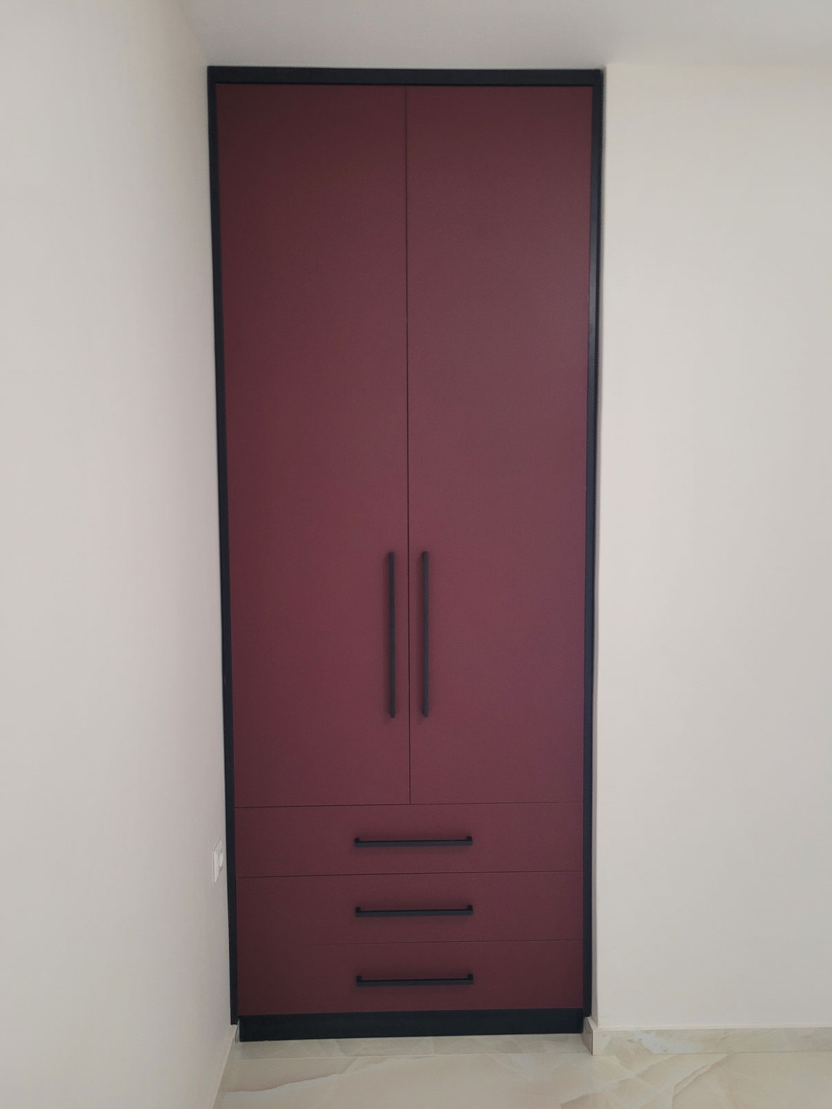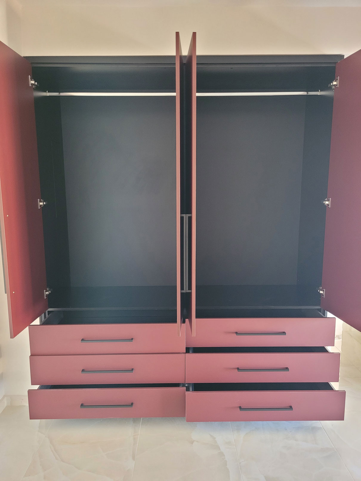 Η τετράφυλλη ντουλάπα σχεδιάστηκε με πόρτες MDF σε μπορντό απόχρωση και κουτιά από μαύρη μελαμίνη, συνδυάζοντας αισθητική και στιβαρή κατασκευή.