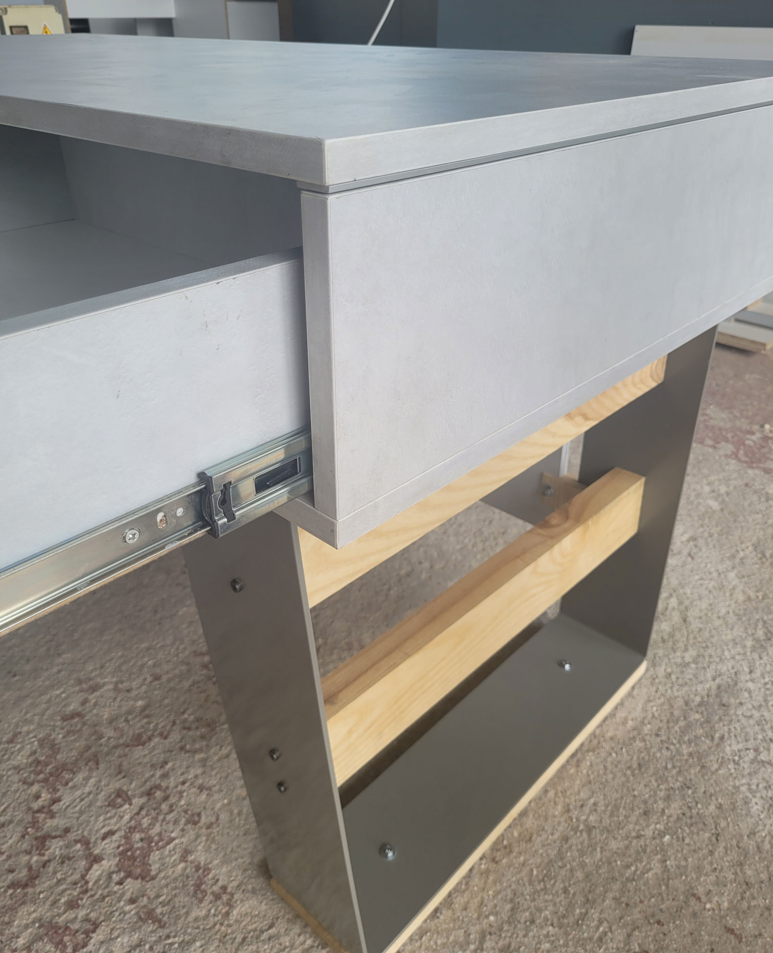 Τα συρτάρια είναι εξοπλισμένα με μηχανισμούς Blum, προσφέροντας αθόρυβη και ομαλή λειτουργία, ενώ οι διακριτικές κλειδαριές προσθέτουν στοιχείο ασφάλειας και εργονομίας.