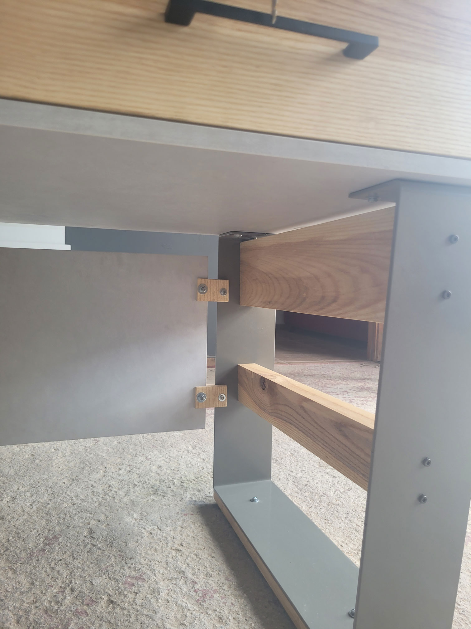 Τα μεταλλικά πόδια με ηλεκτροστατική βαφή συνδυάζουν στιβαρότητα με σύγχρονη αισθητική. Η γεωμετρία τους δημιουργεί σταθερότητα, ενώ τα ξύλινα ενθέματα προσδίδουν φυσικό τόνο, ισορροπώντας τον industrial χαρακτήρα.
