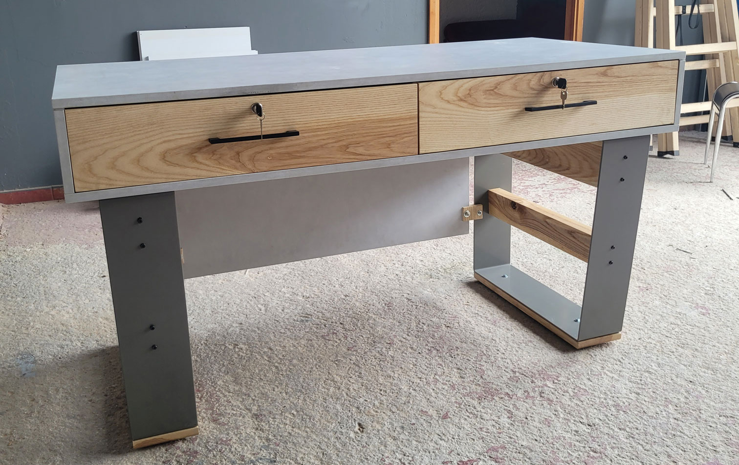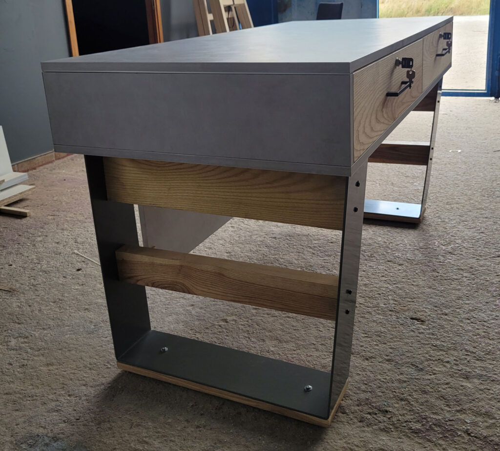 Αυτό το γραφείο είναι μια αληθινή μελέτη αντίθεσης και ισορροπίας ανάμεσα στο industrial design και τη φυσική ζεστασιά του ξύλου. Η μασίφ ξύλινη επιφάνεια προσφέρει στιβαρότητα και καθαρές γραμμές, αναδεικνύοντας την ποιότητα του υλικού και την υφή του φυσικού κορμού.