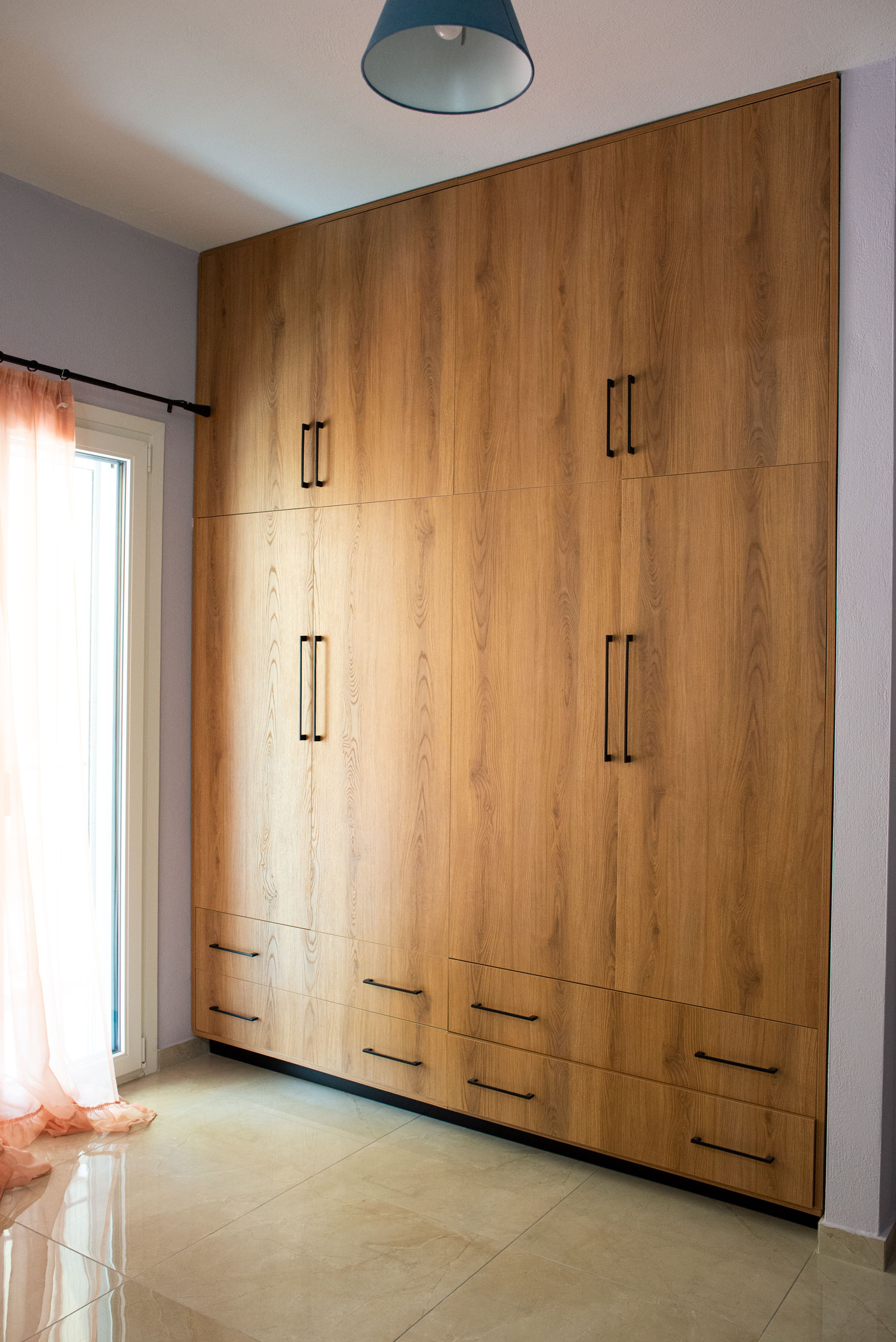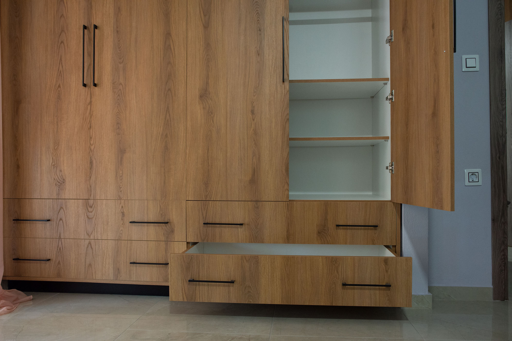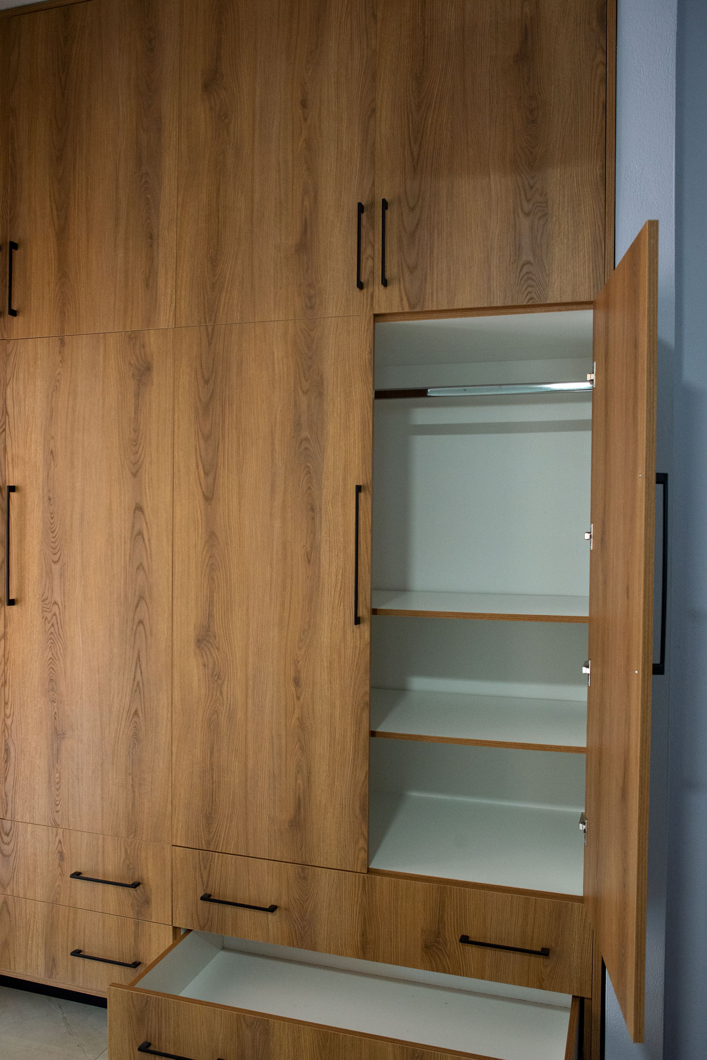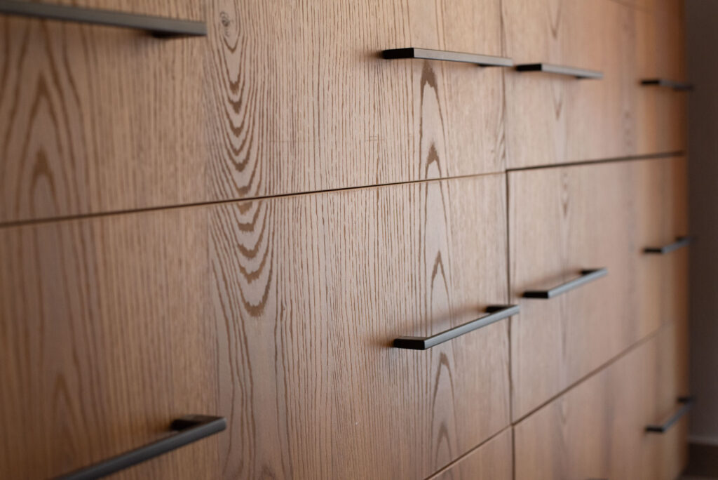 Σε αυτό το project σχεδιάσαμε και κατασκευάσαμε ένα μοντέρνο σετ ντουλάπας και συρταριέρας, με έντονη ρουστίκ υφή που προσθέτει βάθος και χαρακτήρα στον χώρο. Οι επιφάνειες έχουν επιλεγεί για να δημιουργούν ένα διαχρονικό αποτέλεσμα, ισορροπώντας ανάμεσα στην αισθητική του ξύλου και τη λειτουργικότητα των σύγχρονων υλικών, όπως ο βακελίτης και η μελαμίνη.